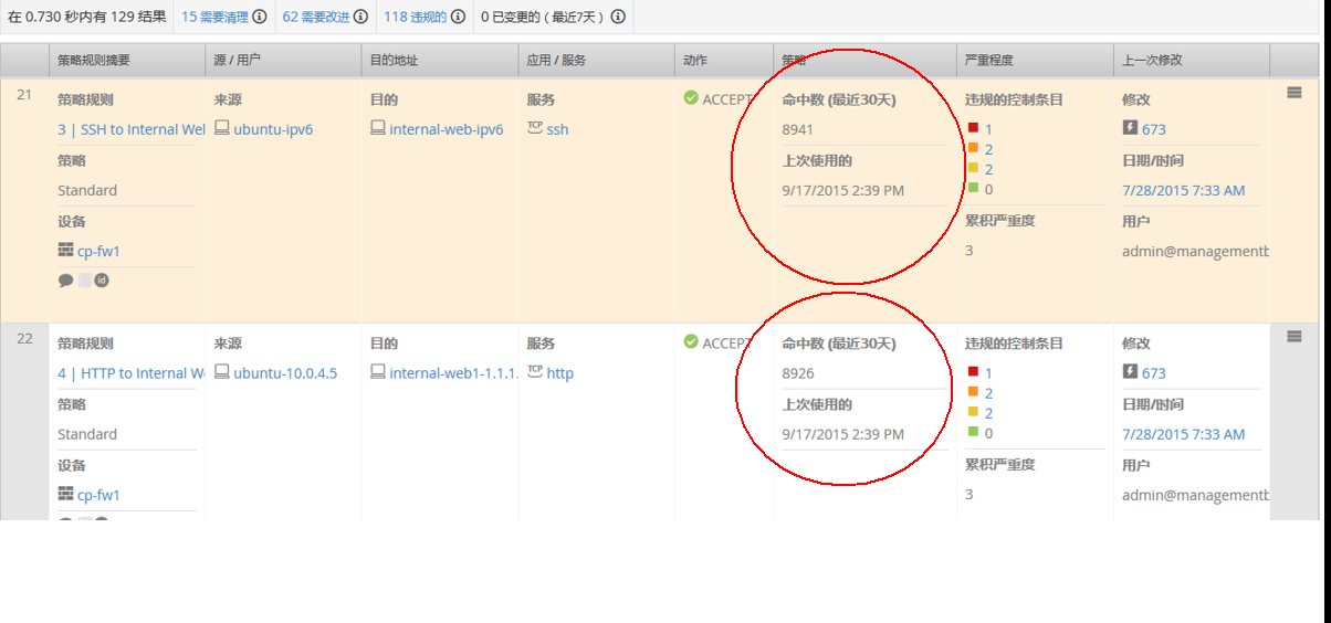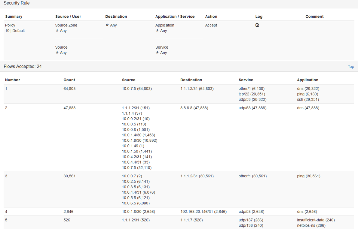 許多防火墻上均會(huì)存在一些過于“寬松”的安全策略,包括允許了過多的IP地址、允許了過多的服務(wù)端口,或者直接是’any’類型的安全策略。這不符合安全策略配置的一般性原則,需要進(jìn)行“收斂”。通過Firemon產(chǎn)品的Traffic Flow Analysis功能,管理員可查看任何一條安全策略的流量詳細(xì)信息,包括各種應(yīng)用的命中次數(shù)等。管理員可以根據(jù)該報(bào)告制定更加有針對(duì)性、更加準(zhǔn)確的安全策略,從而提升防火墻的安全性。
