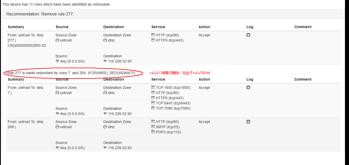 防火墻安全策略配置中通常有大量的無(wú)用,或者冗余的安全策略。過多的安全策略嚴(yán)重降低防火墻的性能及效率。通過Firemon產(chǎn)品,管理員可查看哪些安全策略是不必要的冗余配置,可以根據(jù)該報(bào)告清理多余的安全策略。