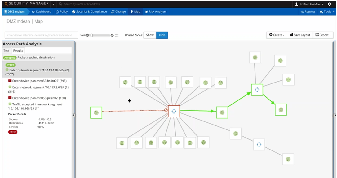 管理員可以利用Firemon產(chǎn)品的APA功能,分析當(dāng)前網(wǎng)絡(luò)結(jié)構(gòu)下,以及防火墻策略配置下,系統(tǒng)內(nèi)的兩個(gè)節(jié)點(diǎn)間的某服務(wù)是否可達(dá),并給出可達(dá)的詳細(xì)報(bào)告,包括路徑、通過的設(shè)備、通過的防火墻設(shè)備命中的哪一條策略等等。這樣,管理員能夠方便的了解所配置的某條策略是否生效,或者是否需要增加新的安全策略來(lái)阻止系統(tǒng)內(nèi)兩點(diǎn)間的某項(xiàng)服務(wù)。