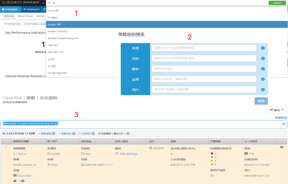 FireMon提供的Insight工具。管理員可在Insight界面中,根據(jù)自己的需求,定義各種條件,Insight可根據(jù)管理員所指定的條件,查詢出結(jié)果。在條件中,可指定設(shè)備、地址范圍、地址類型、用戶名、包含關(guān)鍵字、服務(wù)端口范圍等等,并可自由進(jìn)行組合查詢,非常貼近管理員實(shí)際管理查詢的需求。