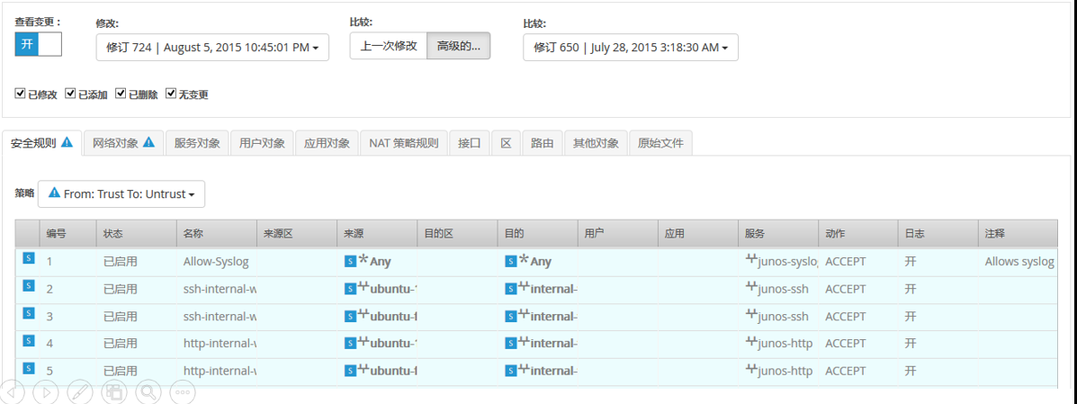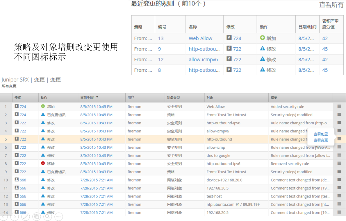 管理員可利用Firemon 產(chǎn)品查看被管理設(shè)備的配置、配置變更記錄,包括變更記錄的詳細(xì)信息,何時(shí)、何地、何人、做了怎樣的變更,并且可比較不同時(shí)間點(diǎn)的配置的異同,并詳細(xì)標(biāo)記差異之處,使得管理員清楚地了解配置的變化,以及變化的過程。