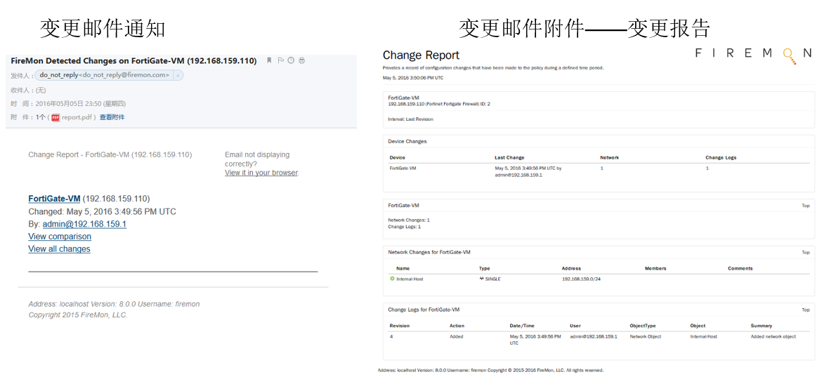FireMon產(chǎn)品會(huì)實(shí)時(shí)監(jiān)控防火墻,當(dāng)防火墻的配置或者安全策略被變更時(shí),根據(jù)配置,可發(fā)送email通知到指定人員或者發(fā)送syslog到log服務(wù)器。