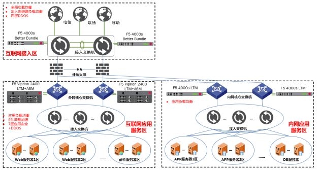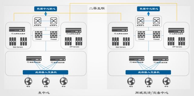 通過F5專業(yè)應(yīng)用交付設(shè)備協(xié)助客戶搭建災(zāi)備數(shù)據(jù)中心。雙中心互聯(lián)網(wǎng)接入?yún)^(qū)部署F5 DNS全局負(fù)載均衡設(shè)備,可以根據(jù)運(yùn)營(yíng)商和用戶地域?qū)⒂脩粢龑?dǎo)至最佳的數(shù)據(jù)中心及最佳運(yùn)營(yíng)商線路,保證數(shù)據(jù)中心靈活、便捷擴(kuò)展,實(shí)現(xiàn)雙中心雙活架構(gòu)。雙中心內(nèi)網(wǎng)則部署多臺(tái)F5 LTM應(yīng)用負(fù)載均衡設(shè)備,采用N+M跨中心集群實(shí)現(xiàn)基于IP業(yè)務(wù)的雙活,業(yè)務(wù)故障或F5故障均可自動(dòng)切換至對(duì)端中心,實(shí)現(xiàn)內(nèi)網(wǎng)應(yīng)用雙活架構(gòu)。