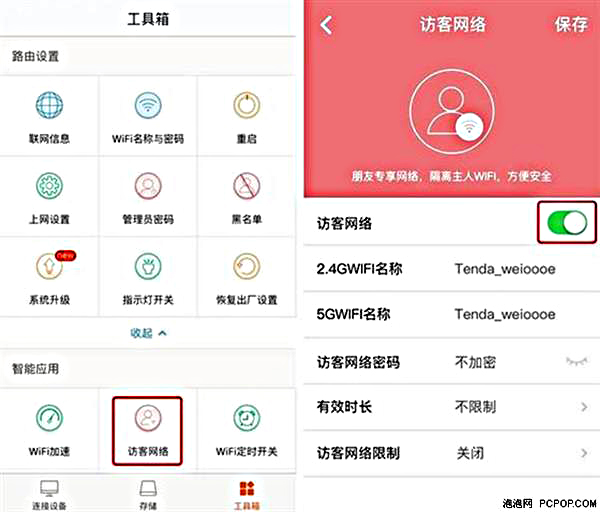 為了方便來訪客人使用無線,可以開啟路由器的“訪客網(wǎng)絡”,設置方式也非常簡單,可以通過手機APP開啟,并根據(jù)個人喜好設置訪客網(wǎng)絡的WiFi名稱、密碼(或不設置密碼也是可以的)、有效時長和網(wǎng)速,然后點擊“保存”即可。