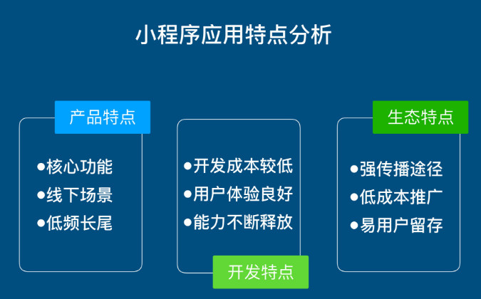 小程序的快速發(fā)展離不開自身的特點,其用戶基數(shù)大,獲客成本低、開發(fā)成本低,使用成本低等特點,都是它成功的關(guān)鍵所在。