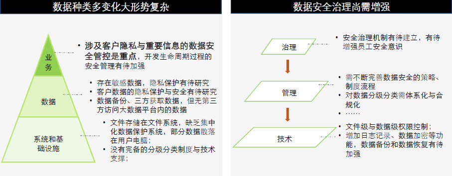 據(jù)了解,國(guó)內(nèi)及全球數(shù)據(jù)安全法規(guī)90%的公司沒(méi)有完全滿足法規(guī)的要求,被查處的違規(guī)損失每次高達(dá)數(shù)百至數(shù)千萬(wàn)元。數(shù)據(jù)安全治理環(huán)境復(fù)雜,挑戰(zhàn)性高,由于涉及多種業(yè)務(wù)與場(chǎng)景,金融企業(yè)數(shù)據(jù)存在種類(lèi)多、變化大、結(jié)構(gòu)復(fù)雜的特性,并存在大量非結(jié)構(gòu)化文件存儲(chǔ)在各類(lèi)系統(tǒng)中,分級(jí)文件未運(yùn)用統(tǒng)一系統(tǒng)管理相應(yīng)訪問(wèn)權(quán)限、客戶數(shù)據(jù)未按重要程度進(jìn)行劃分或隔離、還需加強(qiáng)相關(guān)安全控制措施確保這些數(shù)據(jù)的保密性、完整性和可用性。