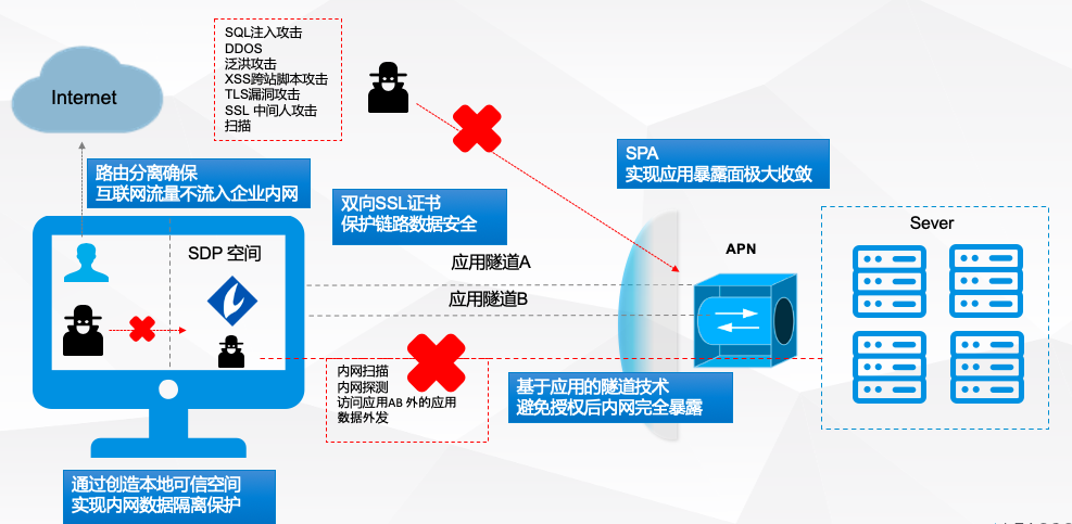 SDP架構(gòu)隱藏核心網(wǎng)絡(luò)資產(chǎn)與設(shè)施,使之不直接暴露在互聯(lián)網(wǎng)下,使得網(wǎng)絡(luò)資產(chǎn)與設(shè)施免受外來安全威脅。