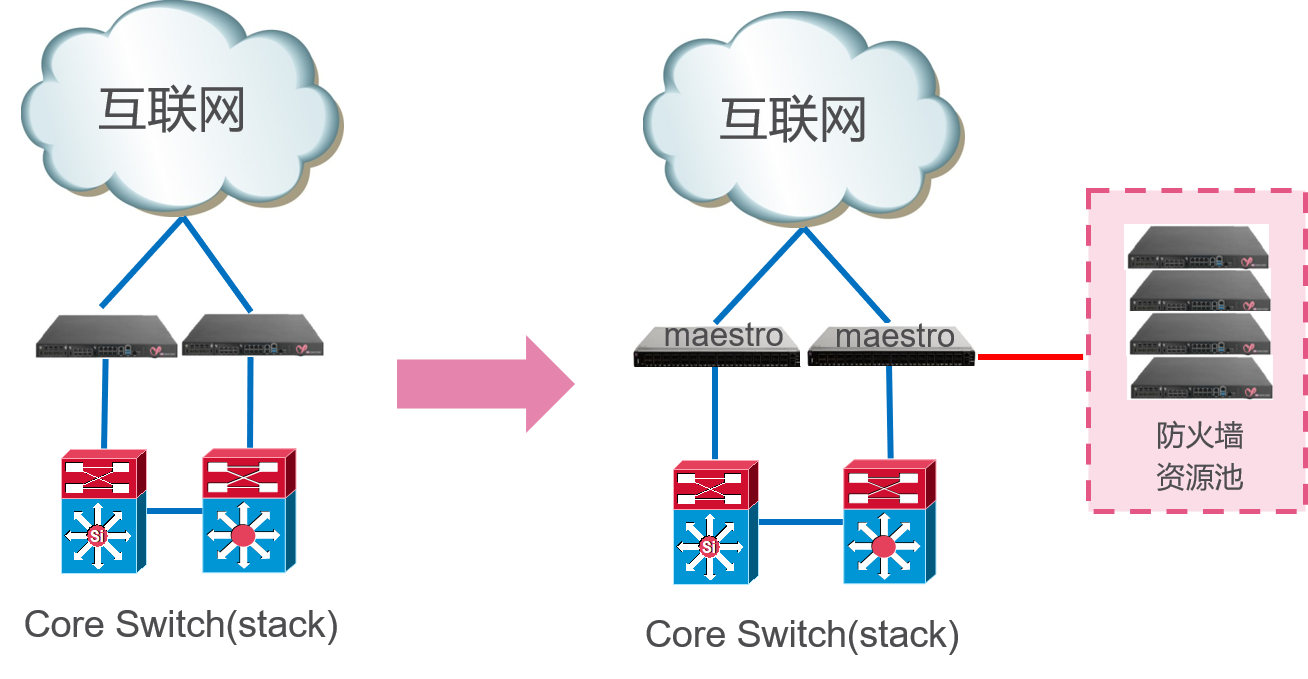 用上Maestro設(shè)備后,原本放防火墻的地方,現(xiàn)在全部放置為Maestro設(shè)備,至于防火墻設(shè)備則全部外置,這樣做的好處在于,可根據(jù)需求隨時(shí)增加防火墻的數(shù)量,且不影響業(yè)務(wù)。