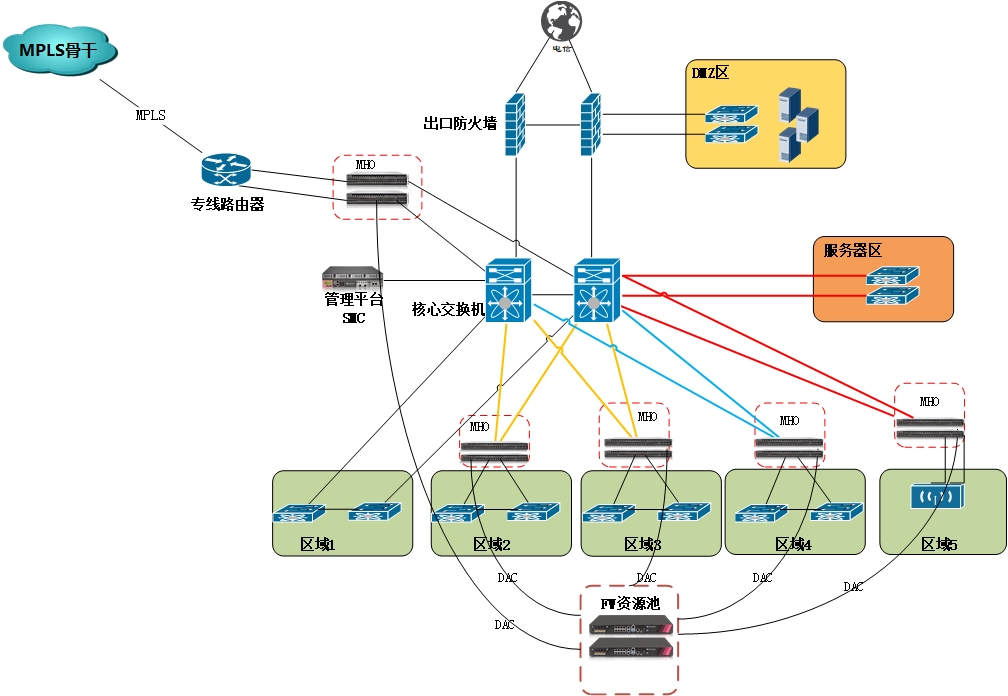 兩臺(tái)Maestro集群,兩臺(tái)Gateway作為資源池疊加,Maestro和Gateway通過(guò)DAC線進(jìn)行互聯(lián),Gateway虛擬出5臺(tái)虛擬防火墻分別承載五個(gè)區(qū)域邊界安全防護(hù)。
